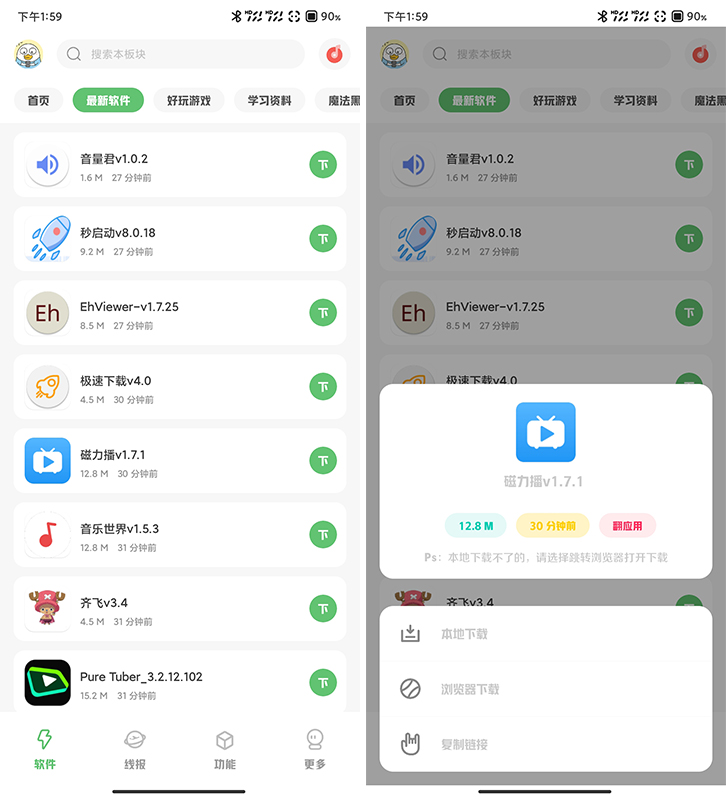 翻应用app最重要的功能,其实还是应用下载功能。在软件页面,四哥会每天分享优质的应用,支持本地下载和浏览器下载两种下载方式,同学们自己选择即可。除了应用,还有一些四哥自费购买的游戏,​是不是很酸爽~
