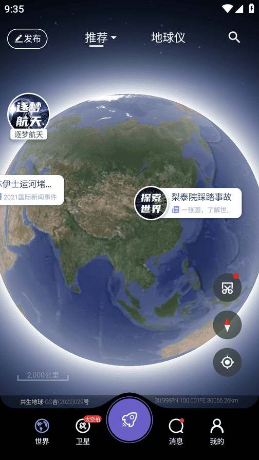 共生地球(官网)是一款免费的国产卫星影像地球信息应用软件。该APP涵盖了大量交互、体验玩法,其中比较推荐的是3D影像、最新影像、对比影像及遥感功能,通过点击主界面当中的“推荐”即可了解,都能直观地感受到立体效果的视觉冲击。另外,不仅仅只是查看卫星地图,其还支持路线规划、实时轨迹、户外测量、新闻热点卫星图片等功能。当然了,相比谷g地球而言还是有些差距的,但整体还算是可以的了。