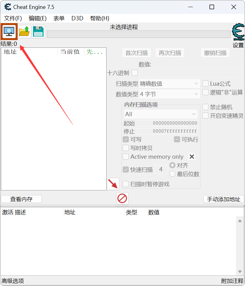 我们打开Cheat Engine,点击电脑标志打开进程。