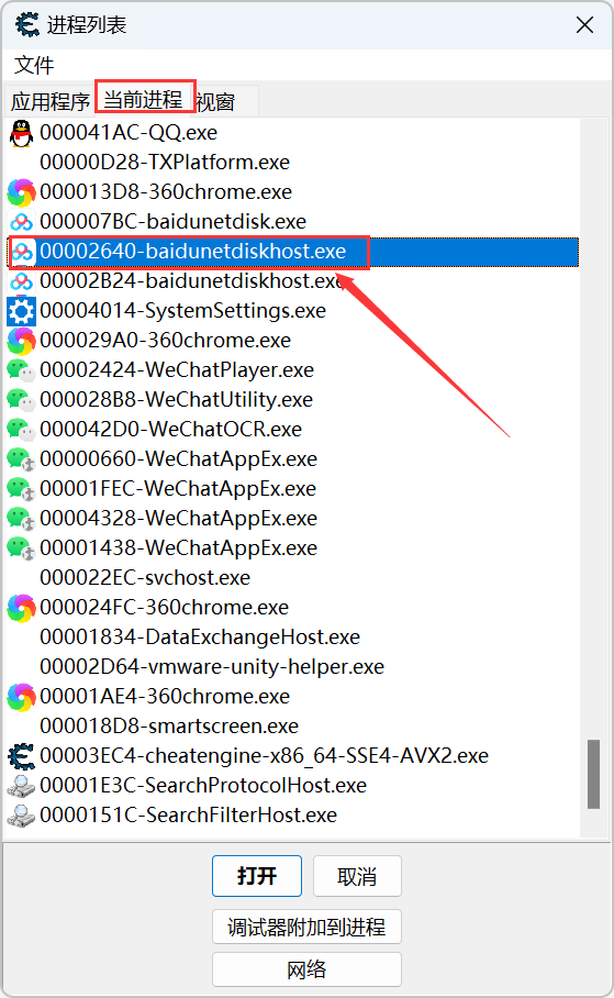 在当前进程中,我们可以看到有三个百度网盘的进程,我们双击第二个。(如果第二个不行可以试试第一个和第三个)