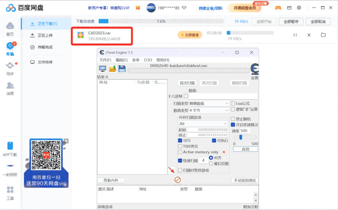很多小伙伴问我百度网盘如何突破限速,我一般回答用阿里,哈哈,但是很多资源都在百度网盘上,阿里毕竟时间太短了,资源不足。关于百度网盘不限速,我发过idm+油猴插件,也发过客户端,但是看来目前此方法可刑,操作也比较繁琐,还容易被官方限速,所以我在这里并不是很推荐。所以今天呢,给大家分享两种方法解决百度网盘限速问题!一:Cheat Engine加速方法
