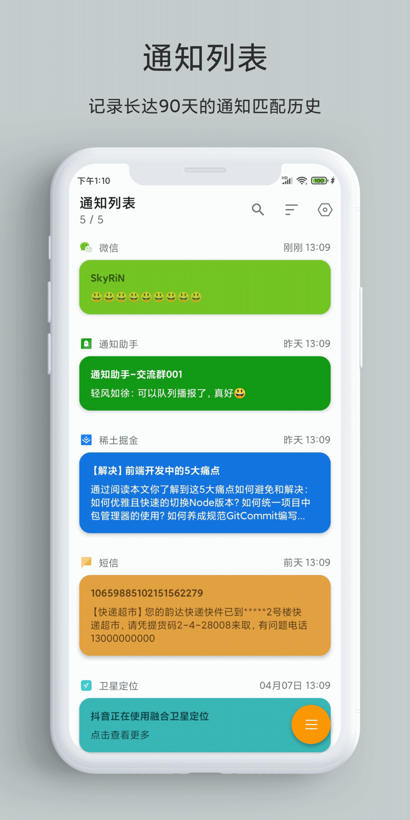 通过精确的匹配规则,它可以将您的通知分类,从而让您只关注重要的消息,同时也可以自动执行一些操作,比如自动提取验证码、自动回复短信或邮件等。它甚至可以帮助您消除广告推送,让您的手机更加干净整洁。
