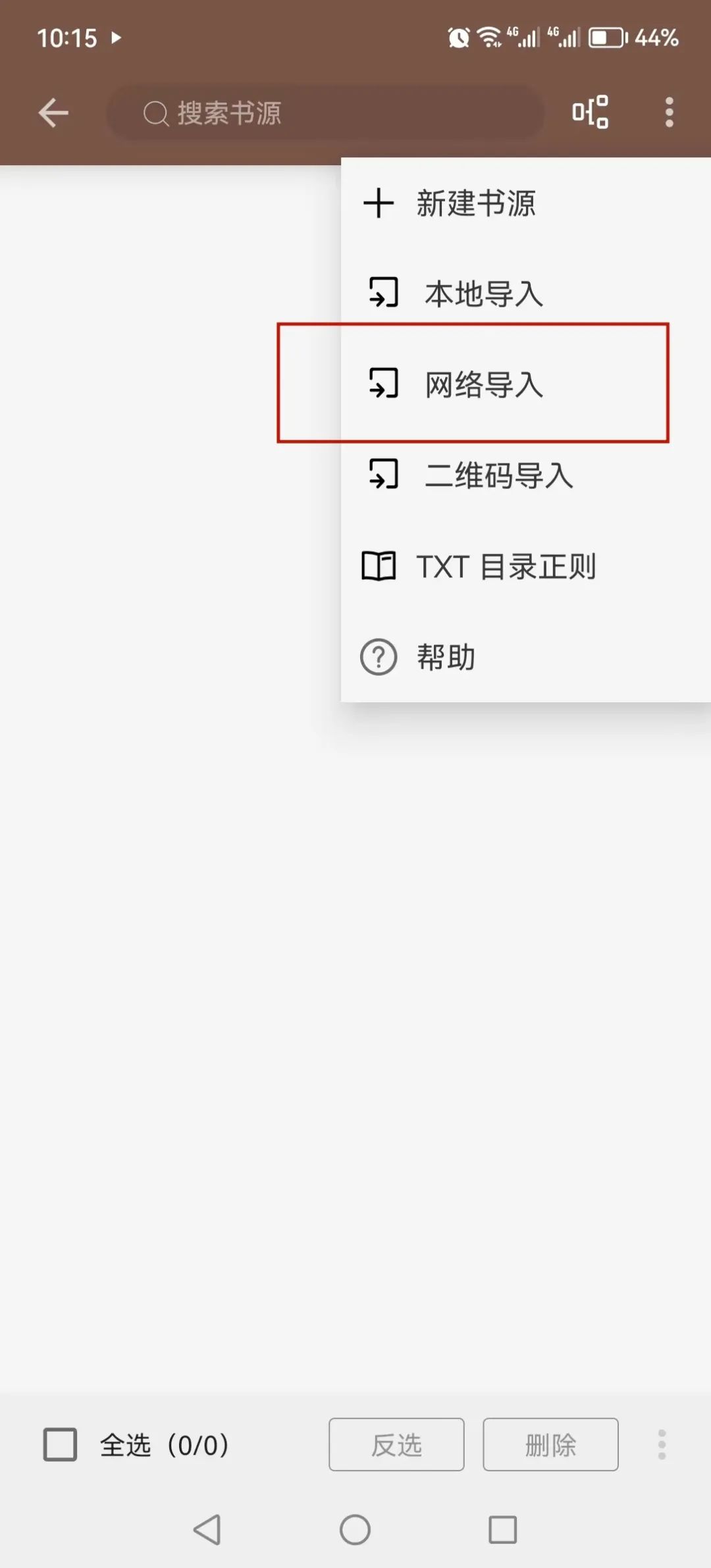 初次打开是个空壳,点击右下角,找到【书源管理】点击【网络导入】(公众号文末有提供书源,若有其它方式也可自行导入)
